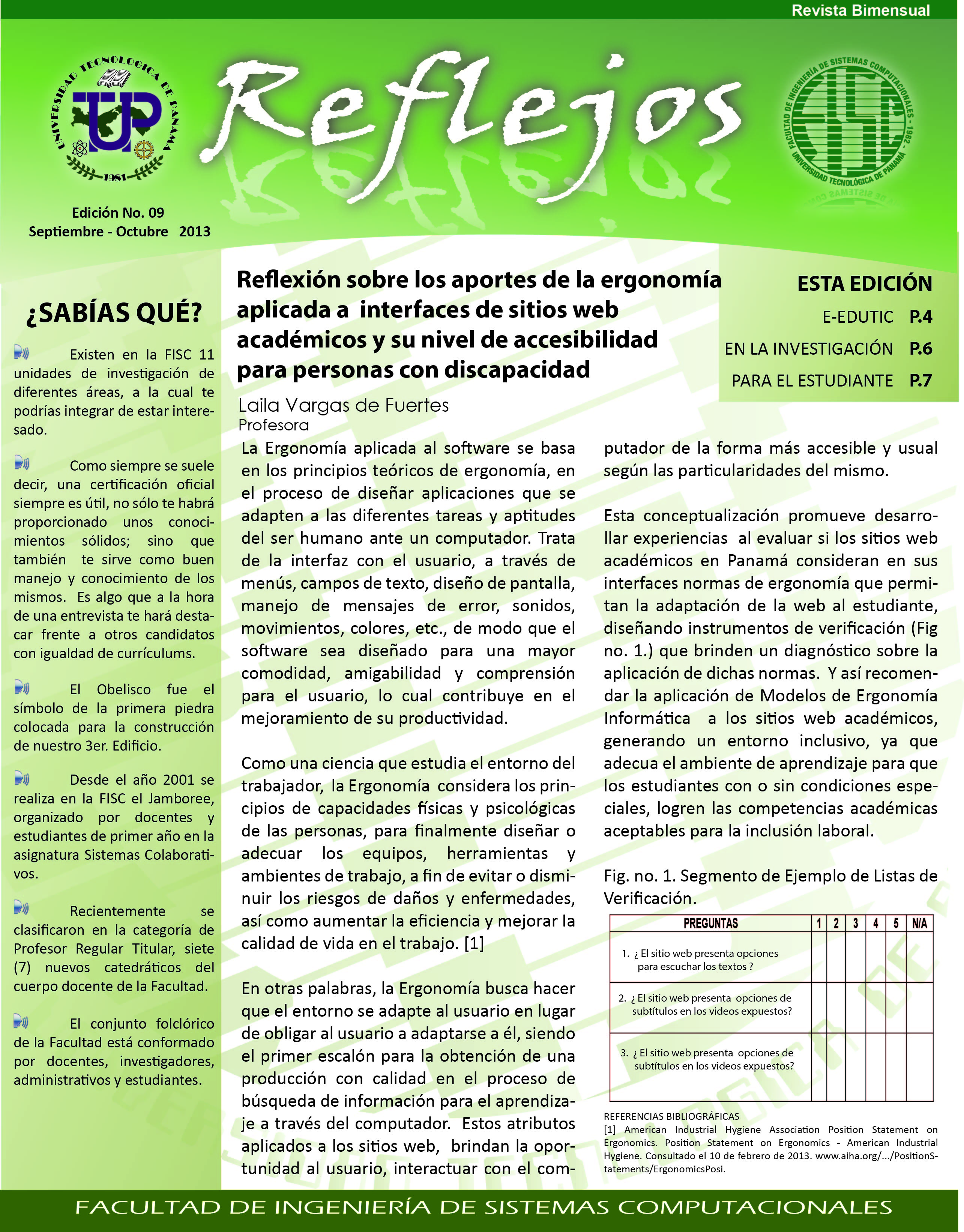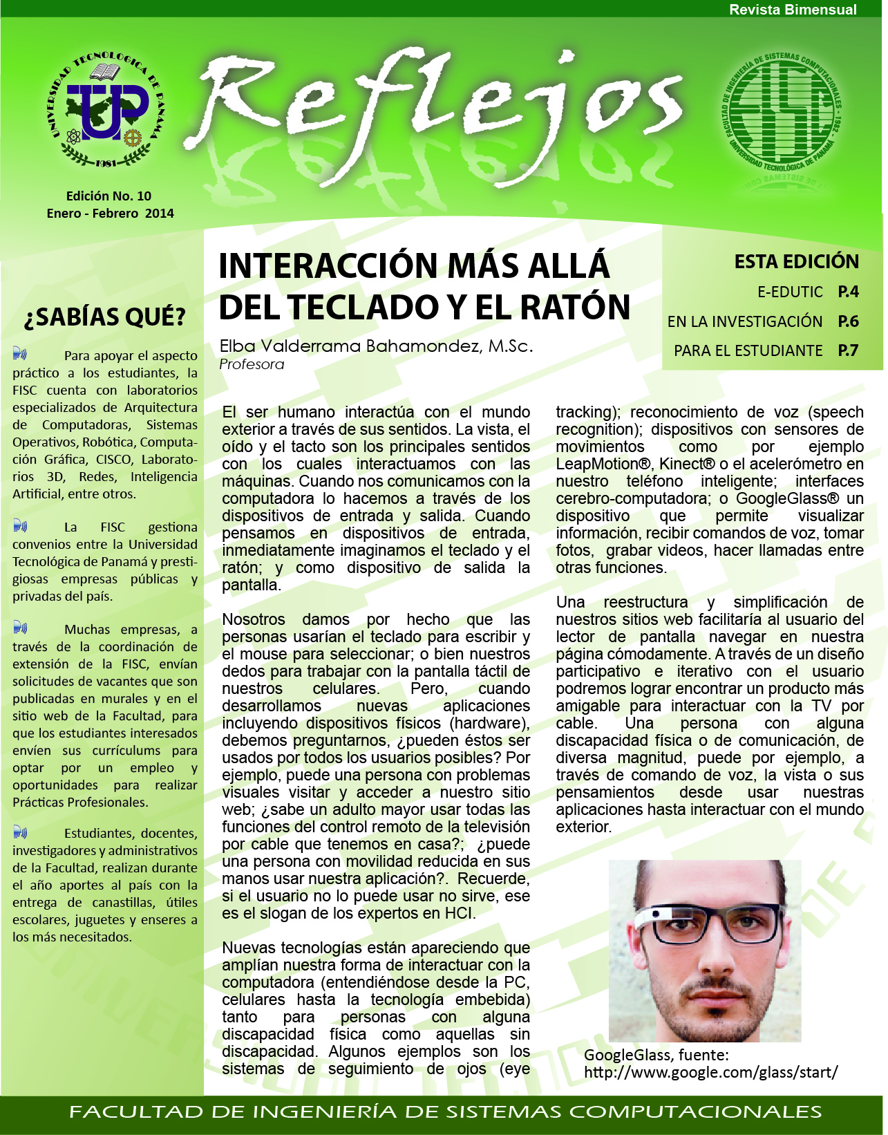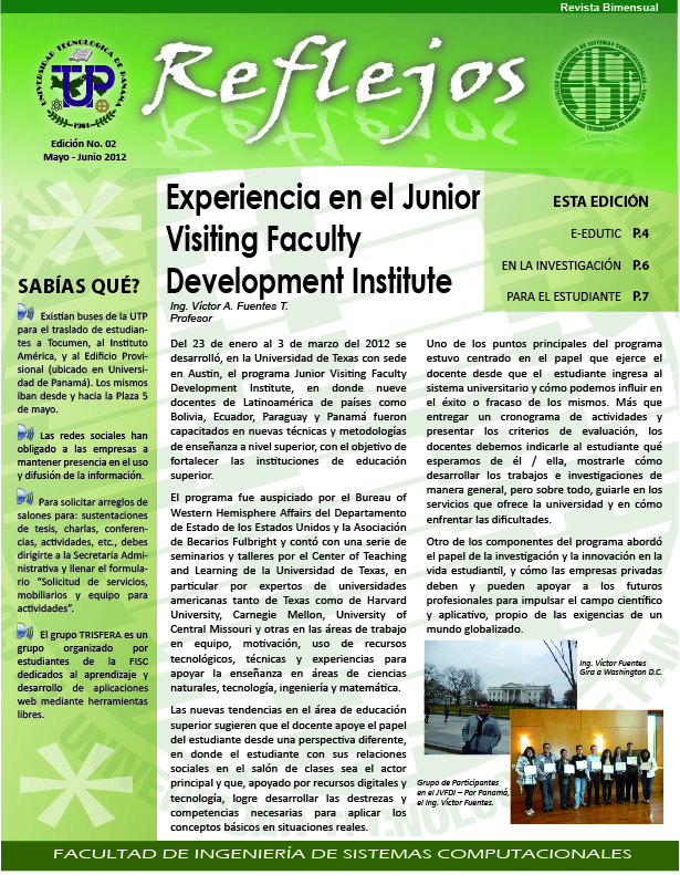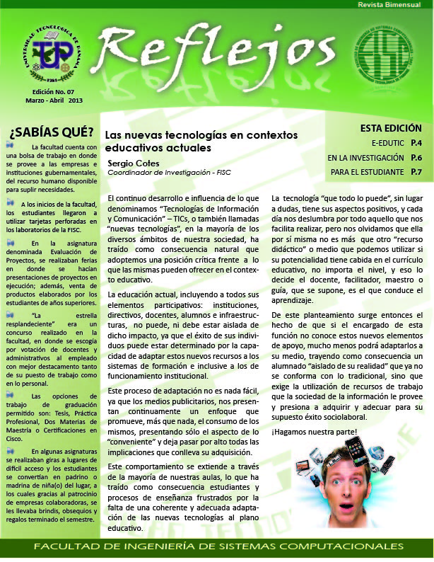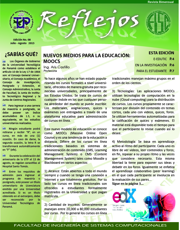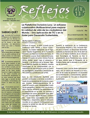 Reflejos - Edición No. 7- Marzo - Abril 2013 La Universidad Tecnológica de Panamá, y por ende la Facultad de Ingeniería de Sistemas Computacionales como parte de ella, juegan un rol importante en el devenir histórico del país. En estos momentos el país vive un periodo importante para su desarrollo y para el fortalecimiento de su democracia; hablamos del proceso electoral del 2014.