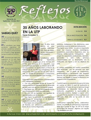 Reflejos - Edición No. 2 - Mayo - junio 2012 Durante el mes de abril de 2012 recibimos a los pares externos en el marco de nuestra acreditación institucional; con gran júbilo celebramos la próxima obtención de la acreditación desde nuestra histórica entrega de Informe aquel 29 de febrero, actividad que más que obligarnos a hacer cambios en el modo de hacer las cosas, documentó nuestro estilo de vida. En la UTP la calidad ha sido nuestro estilo de vida. Con tan solo 31 años de existencia como Universidad, nuestro aporte al desarrollo de Panamá y a la manera de trabajar en el tercer nivel de educación, ha sido ampliamente reconocido dentro y fuera del país. Hemos marcado la pauta en muchos aspectos que otros han imitado; y todo este logro tiene su génesis en la gente, que con orgullo trabaja día a día en esta Institución, a la que entregamos nuestro esfuerzo, pero sobre todo nuestro cariño. Hoy celebramos el reconocimiento de lo que somos: los mejores del país y de la región. En este año en que Sistemas conmemora 37 años de la enseñanza de la informática en Panamá y 30 años de Facultad, reciban un saludo sincero en reconocimiento a todo lo que se ha hecho por llegar hasta donde estamos hoy. Reflejos. Dr. Nicolás Samaniego |