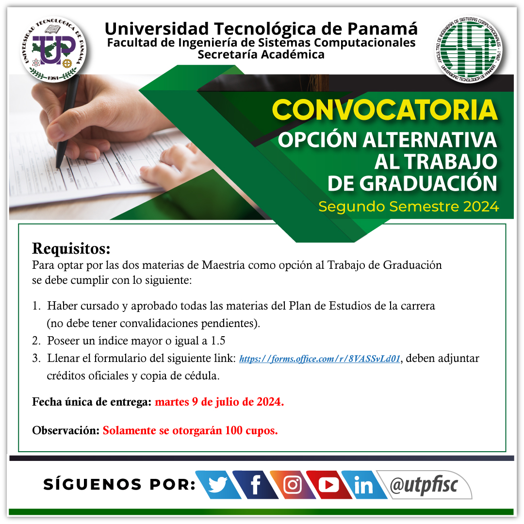 La Facultad de Ingeniería de Sistemas Computacionales convoca a sus estudiante que deseen optar por las dos materias alternativas como Trabajo de Graduación para el Segundo Semestre 2024, la fecha disponible para su inscripción sera el martes 9 de julio de 2024, para ello debe completar el formulario entrando al siguiente link:https://forms.office.com/r/8VASSvLd01, deben adjuntar créditos oficiales y copia de cédula. Observación: Solamente se otorgarán 100 cupos.